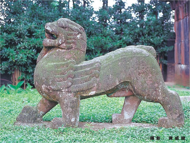 石兽和战国时的青铜翼兽有继承的关系,形状上多似龙虎又如狮,全身从头到尾仍有那起伏流转的强健线条。汉代从西域传入的狮子因为其勇猛而成为吉祥之兽,受到欢迎,石雕自然要和龙虎结合为一了。当然,也有造型较明显的石狮子。
